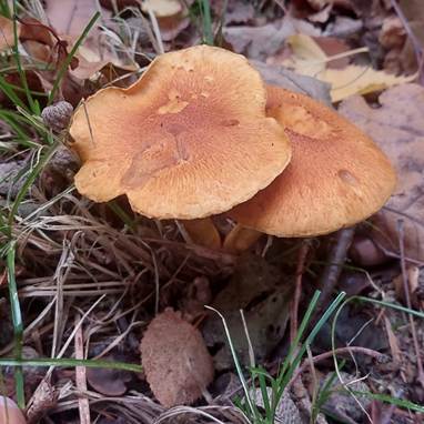 Hier wil ik het hebben over de gewone fopzwam (Laccaria laccata). Deze is symbiont met eiken, beuken … De hoed is uitgestrekt, in het midden vezelig en roomkleurig en aan de randen beige met lichtbruine fijne streepjes. De plaatjes zijn roze en de sporen wit, een typisch kenmerk voor fopzwammen. In het midden van één van de hoedjes  zit er in het centrum een kransje van naar boven gerichte plaatjes. Dit fenomeen zou worden veroorzaakt door een soort  paddenstoelmug. De eieren van de mug worden afgezet in het vlees van de hoed van de fopzwam. De larven zetten de paddenstoel aan om een soort nestje, kamertje, voor hen te voorzien (een beetje zoals bij gallen op boombladeren).