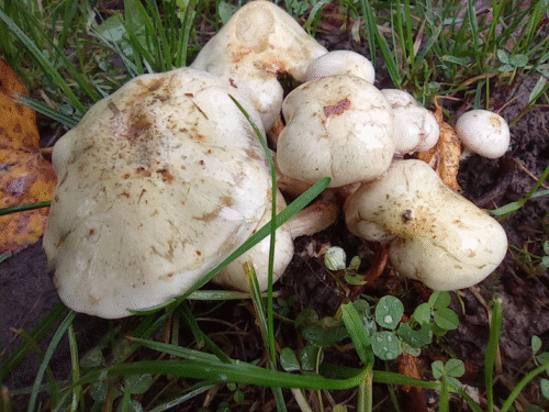 Mijn aandacht in het verslag van Hedwige ging naar de bleekgele bundelzwam (Pholiota gummosa)  . Een zevental paddenstoelen in een bundeltje, in verschillende ontwikkelingsstadia. De hoedjes zijn vuilwit met in het centrum gelige, bruinige vlekken. De plaatjes zijn bleek maar de sporen kleuren bruin. De steel is bleekbeige maar onderaan donkerder, eerder roestbruin. Het is een saprofyt die groeit op dood hout of boomwortels.