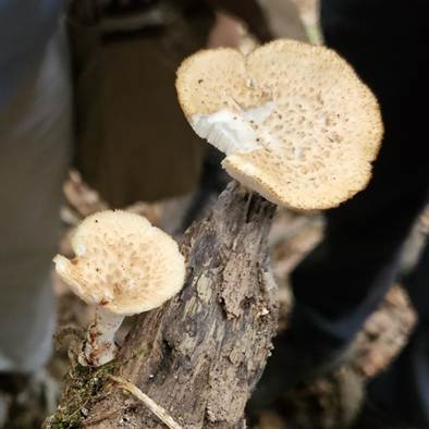 De franjeporiezwam (Polyporus tuberaster) vond ik zelf een mooie. Die leeft op dood hout en heeft gele myceliumdraden. De hoed is bleekbruin, geschubd en komvormig. De buisjes aan de onderkant kleuren mooi wit. De zwam maakt soms bij gunstige omstandigheden een ondergronds knol die de grootte van een voetbal kan hebben. Een oud volksverhaal  zegt dat de knol zich ontwikkelt waar een lynx zijn territorium markeerde met urine. Hier geen lynx en geen knol dus.